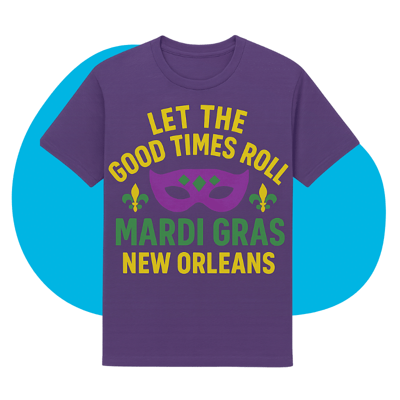 Design colorful tees with Mardi Gras slogans and your business name or krewe insignia-perfect for team wear or resale.