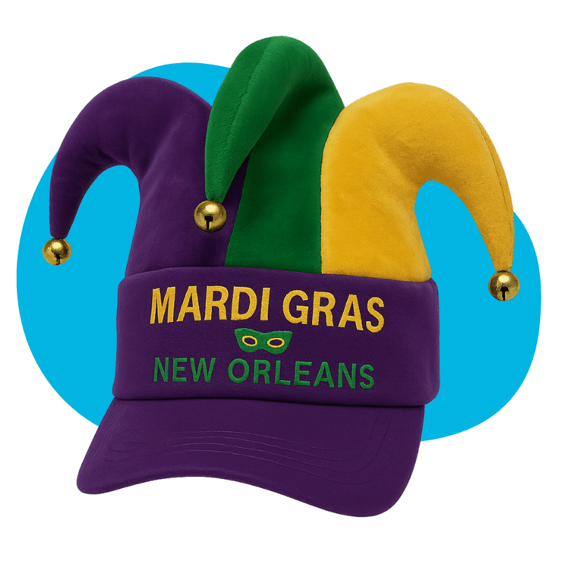 From jester caps to branded baseball hats in purple, green, and gold-give your crew the ultimate carnival look.