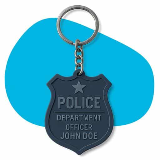 Durable metal or silicone keychains shaped like a badge, complete with department name and officer engravings.