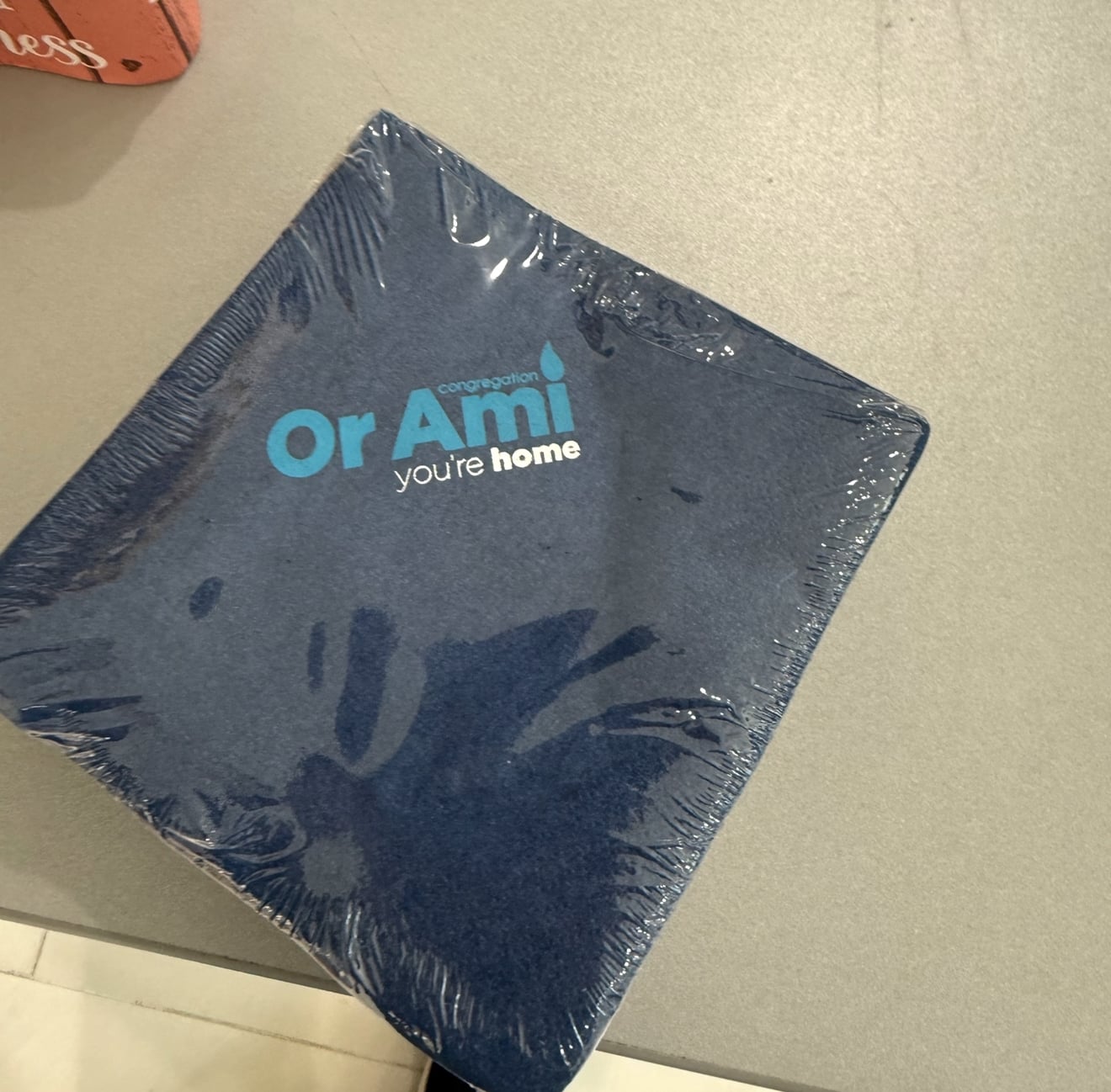 Custom branded disposable tableware for Or Ami Congregation featuring turquoise logo and “you’re home” tagline printed on white paper cups and charcoal gray napkins. Bulk order of stackable cups and cocktail napkins designed for synagogue events, gatherings, and celebrations. Project includes logo application and color matching across multiple product types, coordination with wholesale supplier for bulk pricing, and packaging for easy storage and distribution. Branded materials enhance professional presentation at congregation functions while reinforcing community identity and welcoming messaging.