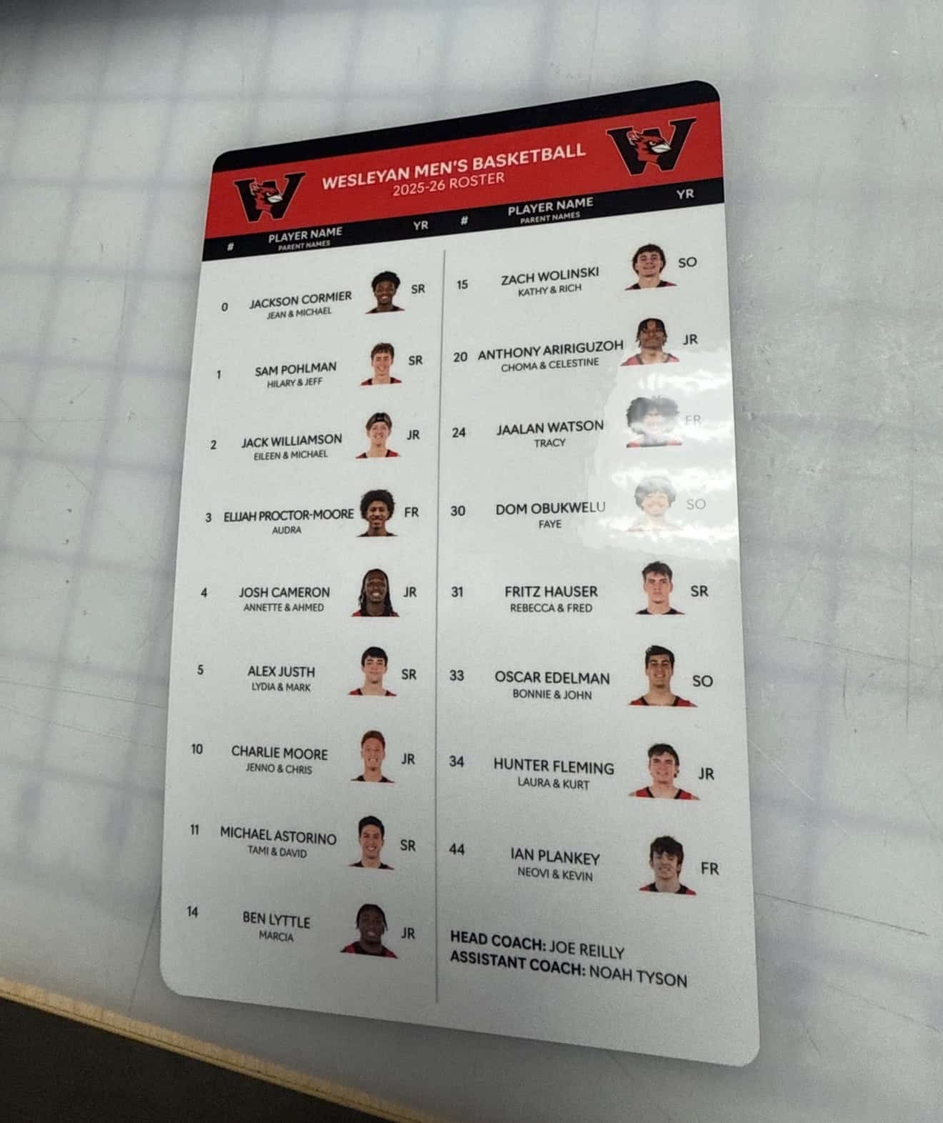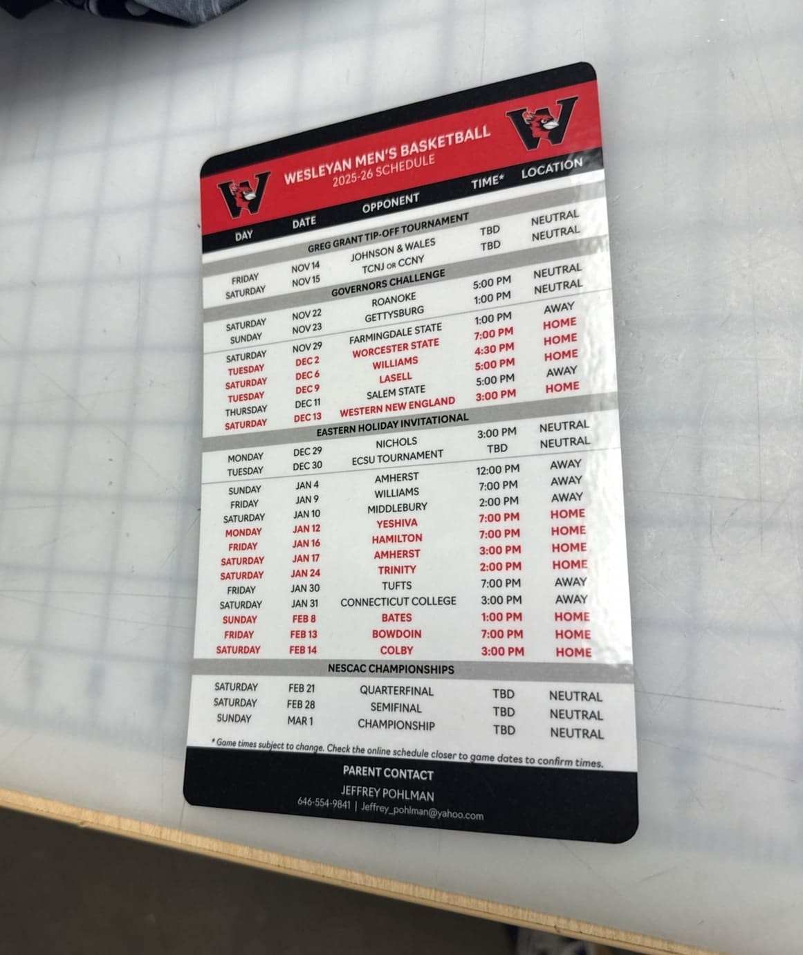Dual-sided magnetic schedule cards for Wesleyan Men’s Basketball 2025-26 season featuring complete game schedule on one side and full team roster with player headshots on reverse. Red and black branded design with Wesleyan “W” logo, rounded corners, and durable magnet backing. Schedule side includes comprehensive season calendar from November through NESCAC Championships in March, with game times, opponents, home/away designations highlighted in red, and parent contact information. Roster side displays player numbers, names, class years, parent names, and individual headshots in organized grid layout with coaching staff information. Project includes graphic design, photography coordination, print production on magnetic material, and distribution planning for fan engagement and program support.